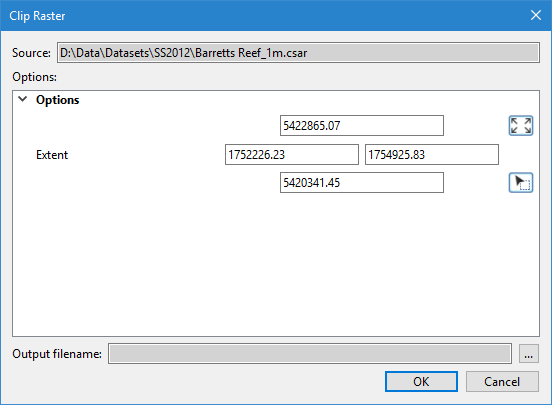 Extent | The extents of the input raster to be exported to a new raster coverage. There are three possible methods for defining the extents: • Manually define a bounding box by entering the coordinates at the middle of the left, right, top and bottom sides of the bounding box and, when available, specify the unit of measure for these values. • Click the Use screen extents button to use the full extents of the current view in the Display window. • Click the Pick from screen button and use the mouse to drag a bounding box around the data to be included in the extents. The extents of the current view are selected by default. The values in the fields will be updated automatically if the extents are changed using either of the button options. These values are entered in the coordinate type and unit of measure of the coordinate reference system of the view, not the view settings defined in Tools > Options. |