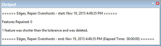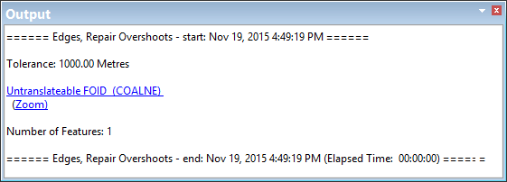 Report | Display a report in the Output window before any repair is done. The edges are listed by feature object ID Click the hyperlinks to select the edges in the Display window. The Zoom hyperlink gives a closer view of the edge. |
