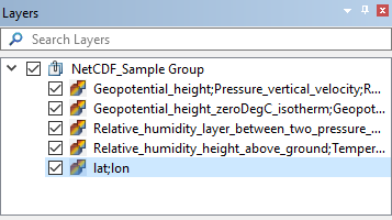 When a netCDF file is opened in BASE Editor, it is displayed in the Layers window as a group layer with multiple data sources present in the group. The data is displayed as a point cloud with attributes.