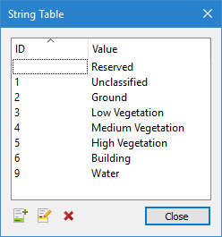 You can see the classifications in use in a given dataset through the String Table Definition property of the Classification band, which launches a dialog box listing the names of the classifications, as well as indices for standard LAS classifications. This dialog box will display only the values currently in use, which may differ with each dataset.