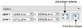 Extent | The extent of the resulting surface. Only source data within these extents will be included in the output surface. By default, the extent of the surface will be set to the current zoomed view of the data (“From data” setting). The Custom option can be selected to activate the coordinates fields below and specify extents for the surface. • Click the Pick from screen button to define a section of the displayed data. This changes the shape of the cursor. Use the cursor to drag a box around an area. • Click the Use screen extents button to create a surface from the full extent of the data. The Upper and Lower X and Y coordinates for the area will be updated based on the selected command. |