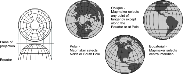 Used for perspective views of the Earth, moon, and planets. The Earth appears as it would on a photograph from deep space.