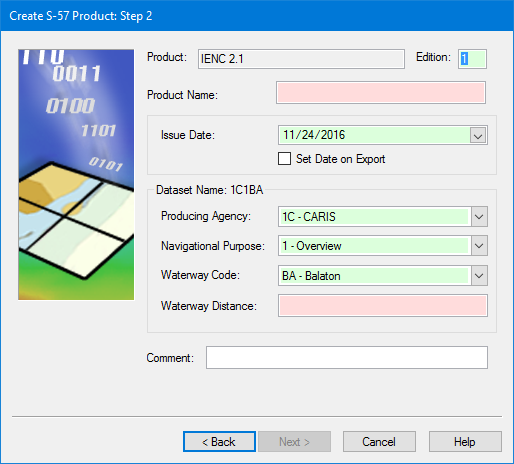 Dataset Name | [Mandatory] A name for the dataset which is built from the fields in the frame: • Producing Agency: A two-character code that designates the hydrographic agency that owns the data. Select from the list. • Navigational Purpose: The scale range of the product. Select from the list. • Waterway Code: A code used to identify the waterway. Select from the list. • Waterway Distance: The length of the selected waterway. This has a minimum of three digits. For example, |