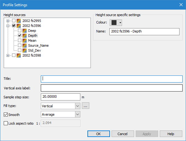 Colour | The colour of the profile line in the Profile window. A different colour can be selected for each profile line if multiple height sources are selected. 1. Select an enabled height source. 2. Select a colour from the drop-down colour picker. 3. Repeat for each enabled height source. |