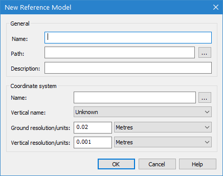 Cooridinate System Name | The horizontal coordinate reference system (CRS) for the reference model. 1. Click the browse button (...) to launch the Select Coordinate Reference System dialog box and select a CRS. See Change Coordinate Reference System for more information on this dialog box. Reference models do not support Geographic (Lat/Long) coordinate systems because they do not guarantee precise calculations. |