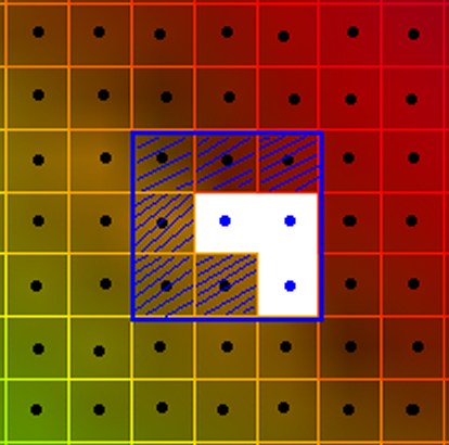 In the image below, the blue square represents a 3x3 matrix area. Each dot within the square is a node. Of those nodes, only the 6 shaded nodes contain data.