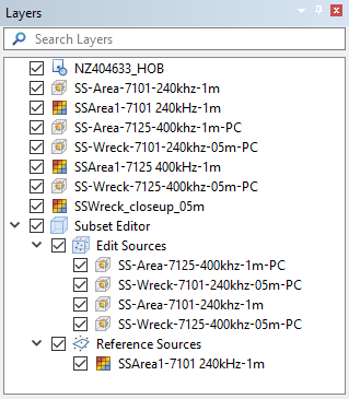 The Reference Sources layer is used to display coverages as reference sources in the subset views. For example, the Depth or Elevation band of another coverage can be displayed as a reference when assessing points.