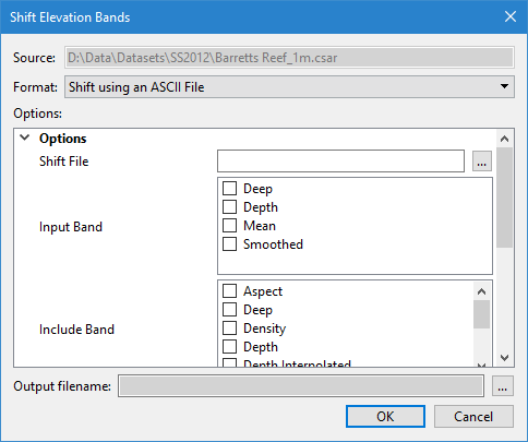 The elevation values in a raster surface band can be used to apply a vertical shift to the values in another coverage. Shift values can be applied to a single elevation band, for example the Depth band, or to multiple elevation bands, such as Depth, Deep and Shoal bands.