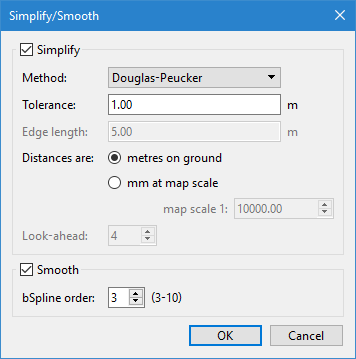 This option is used to apply filtering to the vertices in the selected contours. You can choose the algorithm by which to apply filtering, and whether to filter by metres on the ground or by millimetres (mm) at map scale, which requires you to enter a scale.