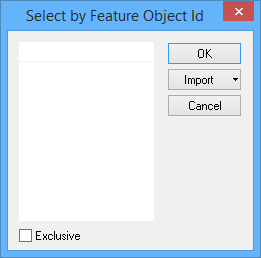 Feature object IDS | Select one or more feature object IDs using one of the following methods: • Type in the box and press <Enter>. A new row is created. Repeat as necessary. • Click Import and select From Clipboard: The contents of the clipboard are copied to the list. For this to work correctly, the clipboard must contain one or more acronyms, each acronym must be on a separate row and the entries must be in all upper-case letters. |