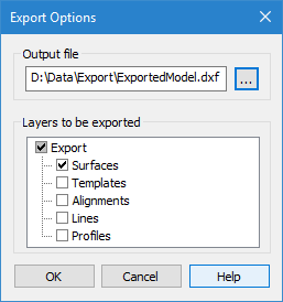 Layers to be exported | The layers from the reference model to be included in the export. Selecting the “Export” layer automatically selects or deselects all layers in the list. If clicked when the dialog box is first opened, it will deselect all layers. Clicking it again will select all layers. When only certain layers are selected, the “Export” check box is shaded in grey. |