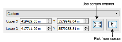 1. Click the Pick from screen to define a section of the displayed data. This changes the shape of the cursor. 2. Use the cursor to drag a box around an area. The Upper and Lower X and Y coordinates for the area will be updated. To create a surface from the full extent of the data: 3. Click the Use screen extents button. The displayed coordinates will be updated. |