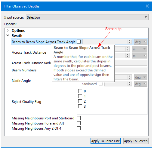 A customized version of the Filter Observed Depths dialog box is used for both Swath and Single Beam filtering.