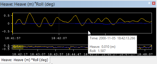 An asterisk next to the name of a data type, whether in the title bar or the window tab, identifies the active data type. In the example below, Roll is the active data in the Heave window.