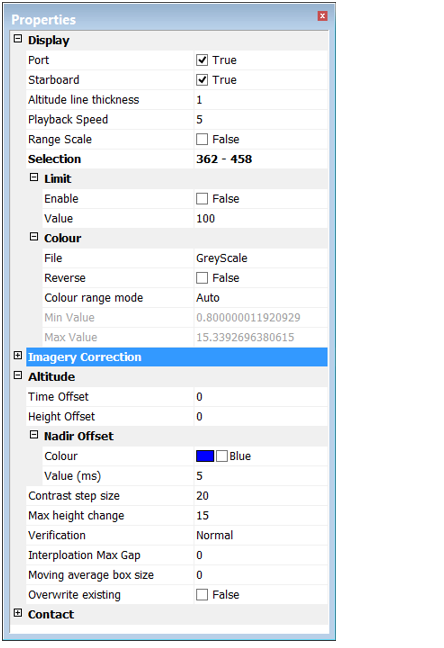 The Properties window contains controls for display, imagery correction and altitude adjustment, as well as the properties of contacts. These properties will be automatically displayed when the Side Scan Editor is opened.