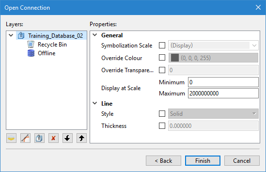 Define the display properties that will be applied to the view when connected to a data source using this connection. These properties are also available in the Properties window once a connection is made in the Layers window and a connection layer is selected. Different property values can be selected for each layer. The properties provided will differ based on the type of connection being created.