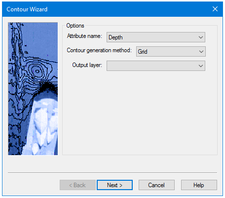 The Output layer list displays feature layers or HOB file layers that can be used to store the contours.