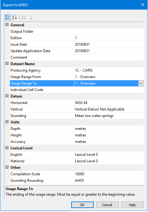 Usage Range From/To | The usage scale range to use to display the data. The From property defines the beginning range setting and To defines the ending range setting. The From range is specified in the file name of the resulting file using the number of the selected range, B4 = 4 - Approach. | |