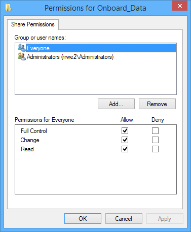 If it does not already exist, you may need to create the directory to be shared, for example, D:\Onboard_Data.