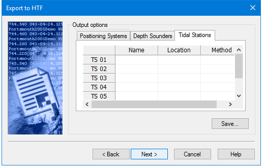The Export Surface to HTF: Output Options step is used to enter details for the Positioning Systems, Depth Sounders and Tidal Stations of the data to be exported.