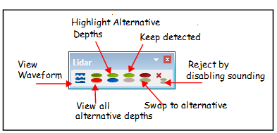The Lidar toolbar controls the display and status options for soundings and associated waveform data in the Swath and Subset Editors.