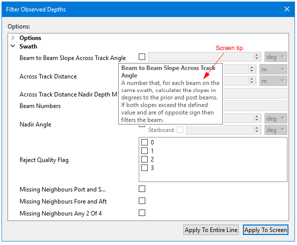 The Filter Observed Depths dialog box is used for Swath and Single Beam filtering. The image below displays the dialog box as opened from Swath Editor.