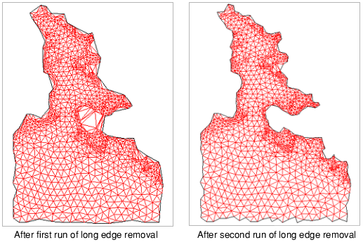 The initial TIN creation produces a convex outer hull. This means that typically long edges are added along the outside of the TIN, over areas where no express data has been collected. It may be desirable to limit the TIN to only the areas where there is true data, by removing long edges. This is particularly important if the TIN is to be cut to a geometry. Removing these long edges is an iterative process that can be run on the data as many times as needed until no hull edges extend beyond the true data coverage.