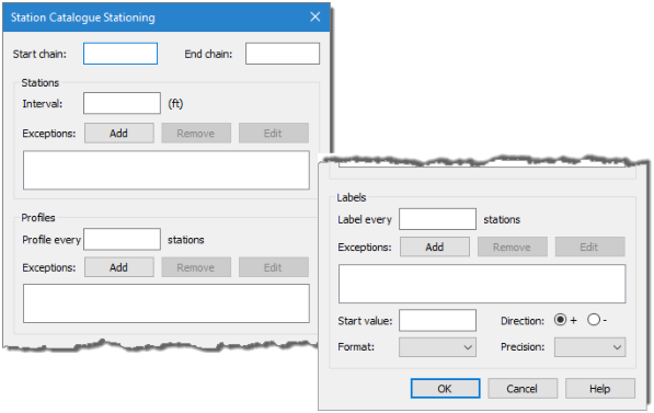 The following dialog box is used to define stationing for a station catalogue.