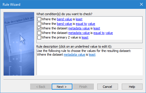 The Primary Z is Least rule looks at the primary elevation band of each coverage, and determines which has the lowest values. This is useful if the coverages being combined use different names for the primary elevation bands.