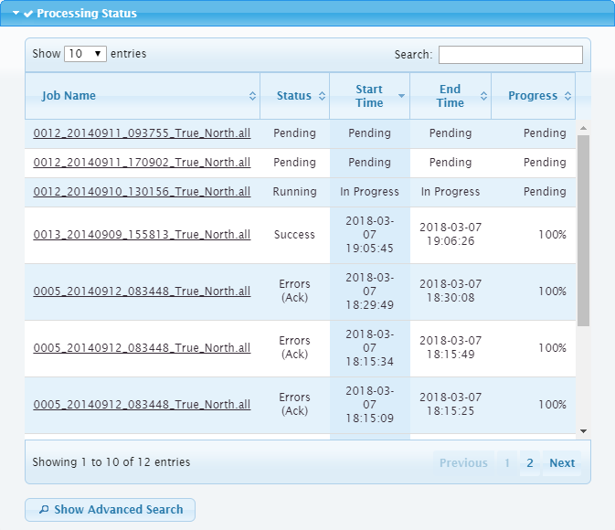 Warning | The job completed successfully, but warnings were issued. For example, if multiple lines were processed in a single job, but not all lines processed successfully, the job would still complete but the messages for the processes will identify lines that failed. |