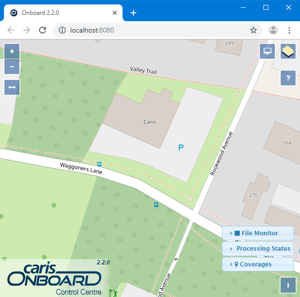 If the computer has an internet connection, there will be an automatic connection to OpenStreetMaps®, centred on the current location of the computer. If no internet connection is available, it will display the Onboard controls with either a blank screen or the base map that is available for download from the Teledyne CARIS Customer Services website. In order for survey data to be included in the display, the Control Centre must be configured. Refer to the Control Centre help for information on how to configure the application.