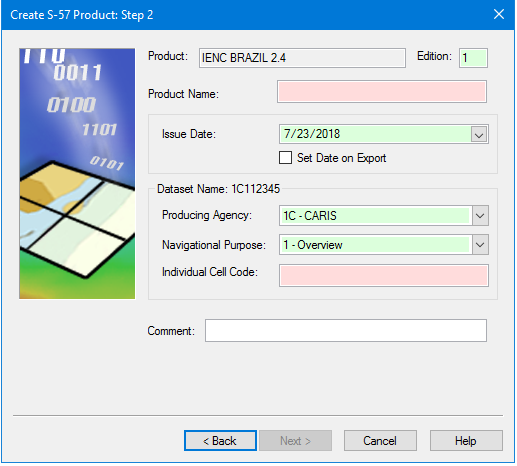 Dataset Name | The name of the dataset is a combination of the options inside the Dataset Name frame. The name is displayed in the frame title as you select the options. • Producing agency: A two-digit code indicating country of origin. Select from the list. • Navigational Purpose: The scale range, or usage, of the product. Select from the list • Individual Cell Code: A unique five-character code that identifies the base cell. |
