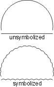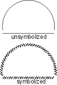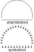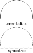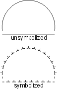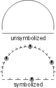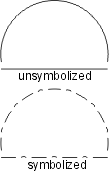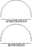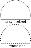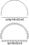| The scalloped line uses the following line pattern definition: • TOL99.9 - used to eliminate all significant points • KSC - changes the symbol ID to SC • BNX.048 - leaves a blank • SYE - places the scallop symbol on the preceding blank; the symbol is sized so that it occupies the entire blank thus giving the appearance of a scallop. The symbol should be designed as shown. The repeat and short patterns are identical to the beginning pattern, except the symbol change command is not included. EXAMPLE19 0 Symbolization example 20 BK N DR 03 05 13 EXAMPLE19 L0 TOL99.9 KOP,BNx.048,SYE (BNx.048,SYE) BNx.048,SYE |