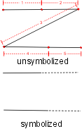 | Example 10 outputs a single line with three different patterns. EXAMPLE10 0 Symbolization example 10 BK N DR 03 05 13 EXAMPLE10 L0 TOL0.0,:1:4,LSS:3,BNX.02(DNx.04,BNx.02 DNx.01) The pattern definition contains a beginning pattern with the following components: • TOL0.0 - sets the tolerance for checking significant points to 0 degrees, which causes all points on a line to be treated as significant. • :1:4) - specifies that line segments 1 (from point 1 to point 2) and 4 (from point 4 to point 5) are to be output literally, i.e. in their unsymbolized form. • LSS:3 - specifies that line segment 3 (from point 3 to point 4) is to be output as blank space. The repeat pattern creates a line with dashes |