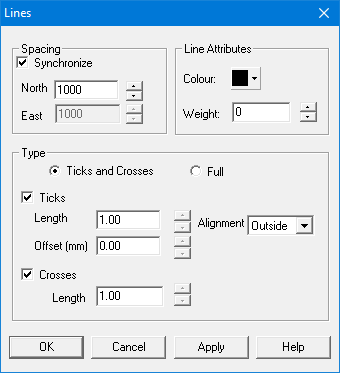 Type | Select the type of grid. • Ticks and Crosses: The grid is formed of ticks and/or crosses. When this is selected, the Ticks option and the Crosses option become available. • Full: The grid is formed of solid lines. |