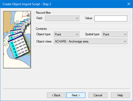 Contents | Map the file contents to a dictionary feature. • Object Type: This is determined from the Shapefile and cannot be changed. • Spatial type: Choose from Edge, Geodesic, and Loxodrome. • Object Class: This contains a list of appropriate features. Choose from the list. |