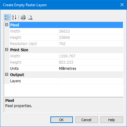 Width | Width of raster layers in pixels. If the no other layers are open, a default value is determined by sheet width. If other layers are open, the width is determined from the open layers and is shown as read-only. Type a value in the field |