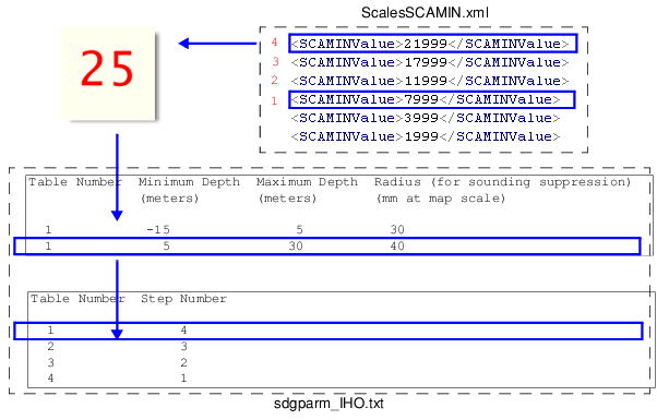 The next higher scale value in ScaleSCAMIN.xml is located and this is used as a starting point for applying the step number. In this case, the closest scale value to 5000 is 7999. A step value of four is used to count up to arrive at a final SCAMIN value of 21999 for the sounding.