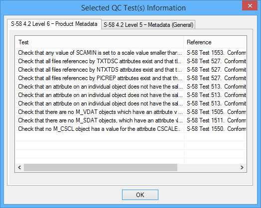Many tests are based on the Recommended ENC Validation Checks (S-58 Ed. 4.2) standard from the International Hydrographic Organization. Additional tests developed by CARIS and some S-58 quality control tests are also included with certain modules. If the validation check is based on the S‑58 standard, the code number is displayed on the right side of the table. Refer to the standard (available from the IHO) for more information on specific S-58 checks.