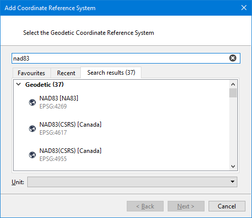 In this step you pick a geodetic coordinate reference system to use as a template to create the custom projected coordinate reference system. The system can be selected from the pre‑populated lists in Favourites or Recent, or you can search for the desired system.