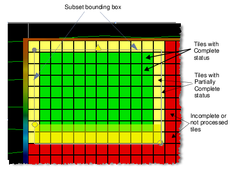 The flagged tiles will be displayed with the colour appropriate to their status. Only tiles totally encompassed by the subset bounding box are flagged with the selected status.