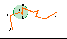 Points D and E fall within the circle so they are deleted. The circle is moved to point F.