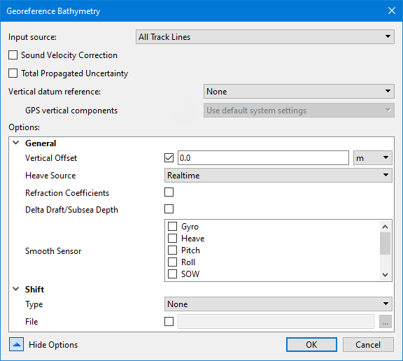 Vertical datum reference | The type of vertical datum to apply to depth values when georeferencing points. The options include: • None: No vertical adjustments are applied. • Tide: A file of observed tidal corrections is applied. • GPS: GPS height values are applied using a model file. Selecting Tide or GPS will cause additional fields to be added to the Options list, specific to each of the datum types. The default is None. |