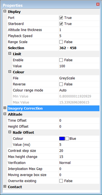 The Properties window contains controls for display, imagery correction and altitude adjustment, as well as the properties of contacts. These properties will be automatically displayed when the Side Scan Editor is opened.