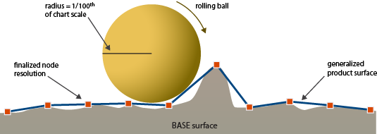Double buffering is like rolling a ball over the surface at an interval determined by the surface’s node resolution. The radius of the ball is determined from the chart scale (radius = 1/100 of chart scale). As the ball is rolled over the surface, the surface is smoothed, but the shoals are retained.