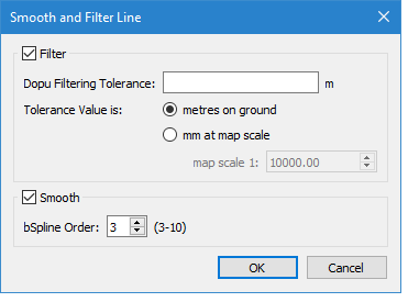 This option is used to apply filtering to the vertices in the selected contours. You can choose to filter by metres on the ground or by millimetres (mm) at map scale, which requires you to enter a scale.