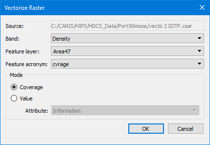 Mode | The mode used to determine where to create polygons for the source data. Two modes are available: • Coverage: A polygon is generated around each set of joined pixels in the source surface. • Value: A polygon is generated around pixels with the same value. This mode is only valid for integer scaler type or string table type bands. When using this option, you must specify the attribute to use for the value of the polygons. |