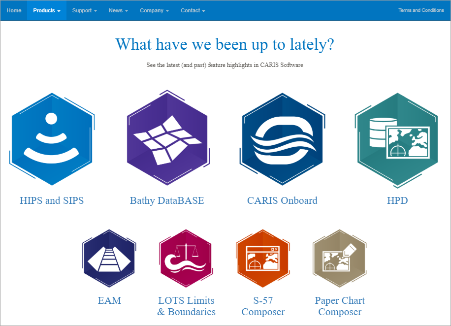 The What’s New! command provides a link to a highlights page on the Teledyne CARIS web site. This page provides information about recent feature highlights in CARIS products. Once the page has been loaded, you can click on the link for each product to see the highlights specific to that product.
