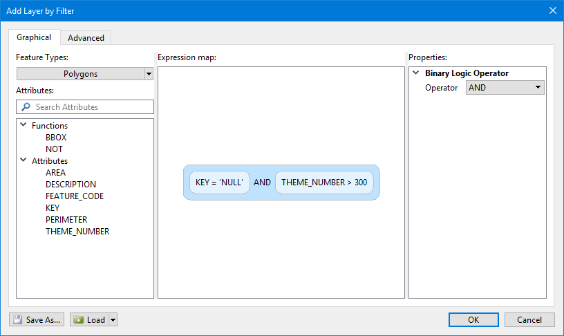 • Graphical: Build a filter expression graphically. You can select attributes, drag them into the expression map, then define properties.