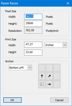 Anchor | The anchor point defines the direction in which the raster layers will be expanded or reduced. 1. Select the anchor point position from the list, or click a button in the dialog box to set the anchor point position. The position of the anchor point and the direction of resizing is displayed. |